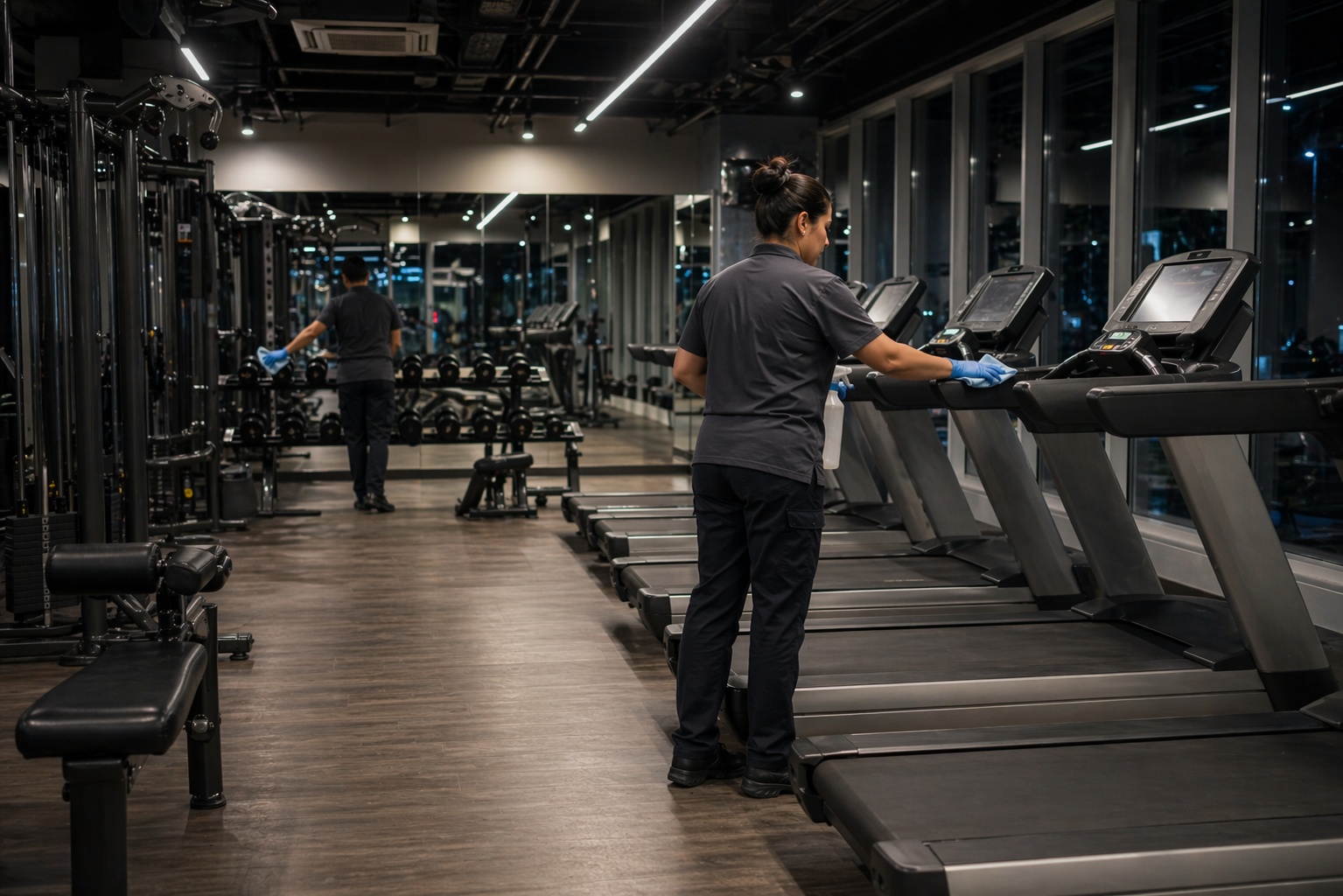 Our nightly crews wipe down every piece of equipment — cardio machines, weight benches, cable handles, and group fitness props — using EPA-registered disinfectants effective against staph, MRSA, and common gym bacteria.